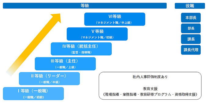 一般職からスタートするキャリア体系を昇って個人の成長を目指していただけます。